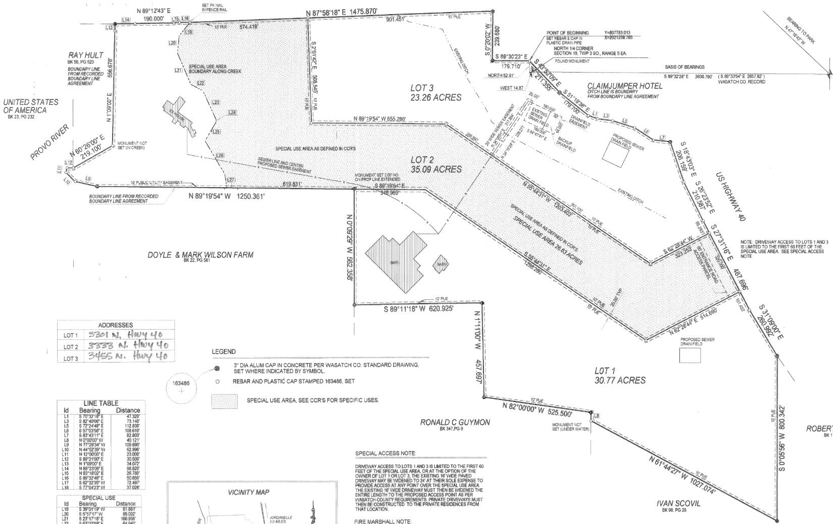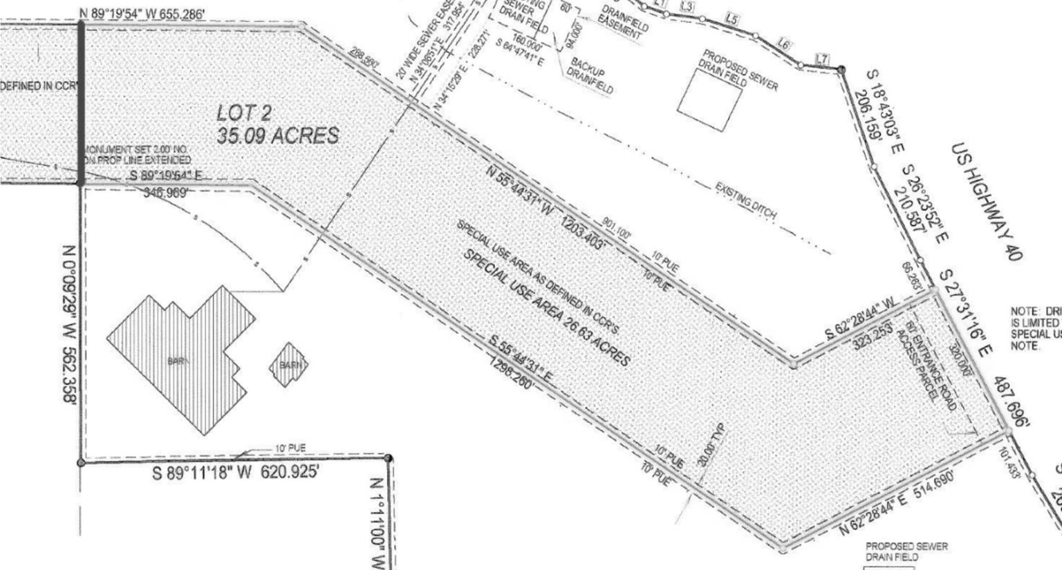 ¶3 An amended plat map for the Subdivision was independently recorded in August 2005 (2005 Plat); this new map showed that Lot 2 was still burdened by a Special Use Area easement, "as defined in [the] CC&Rs," but this time the shaded portion of the Subdivision depicted as the Special Use Area was much larger, extending into the wide western portion of Lot 2 and terminating on its western end not in a straight line but in a meandering line, defined by a creek. The 2005 Plat indicated that the new Special Use Area comprised 33.96 acres. No amendment to the CC&Rs was undertaken in connection with the 2005 amendment to the plat map.